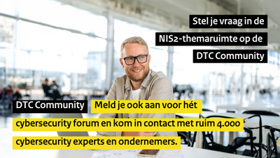 Het DTC biedt ondernemers en securityprofessionals de mogelijkheid om vragen over de Cyberbeveiligingswet te stellen aan de DTC Community in de NIS2-samenwerkruimte. Meld je aan, stel je vraag of deel je kennis met andere professionals die zich ook met de NIS2-voorbereidingen bezighouden.